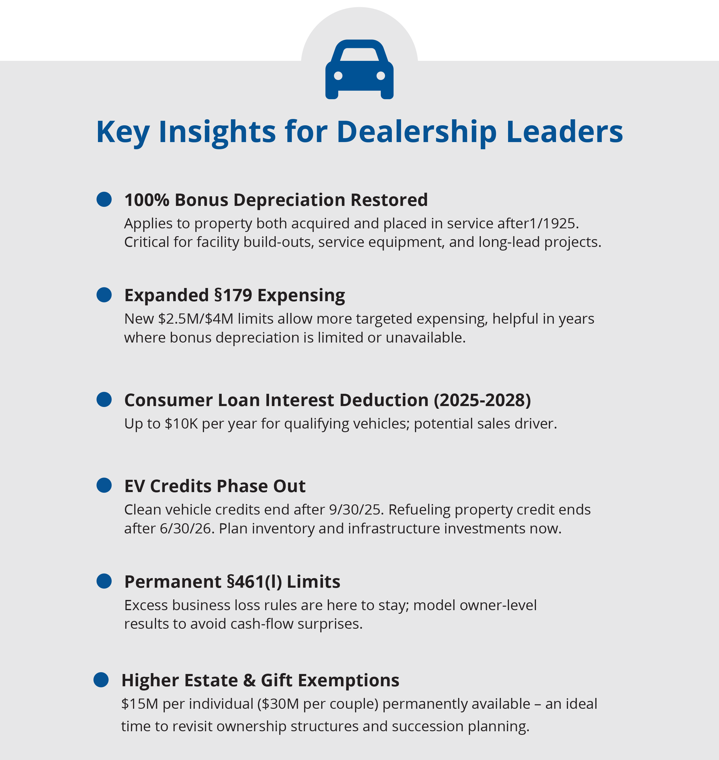 Our team can help you anticipate challenges and maximize opportunities to ensure your dealership’s tax planning is fully aligned with the new landscape.